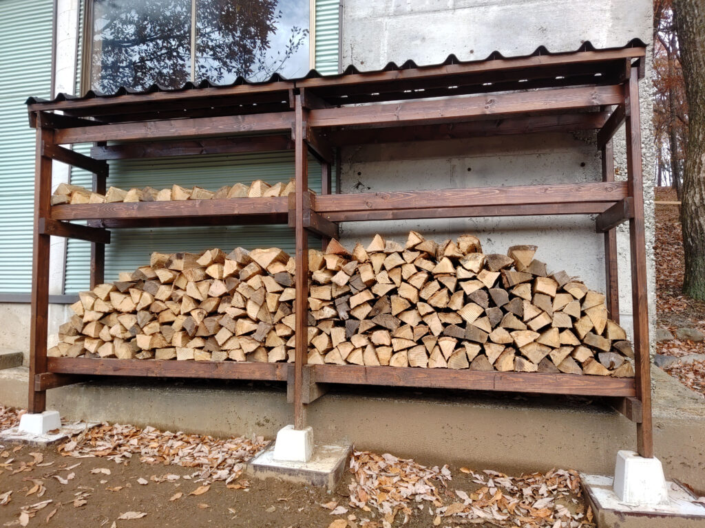 屋根を付けて、ついに薪棚1号が完成。